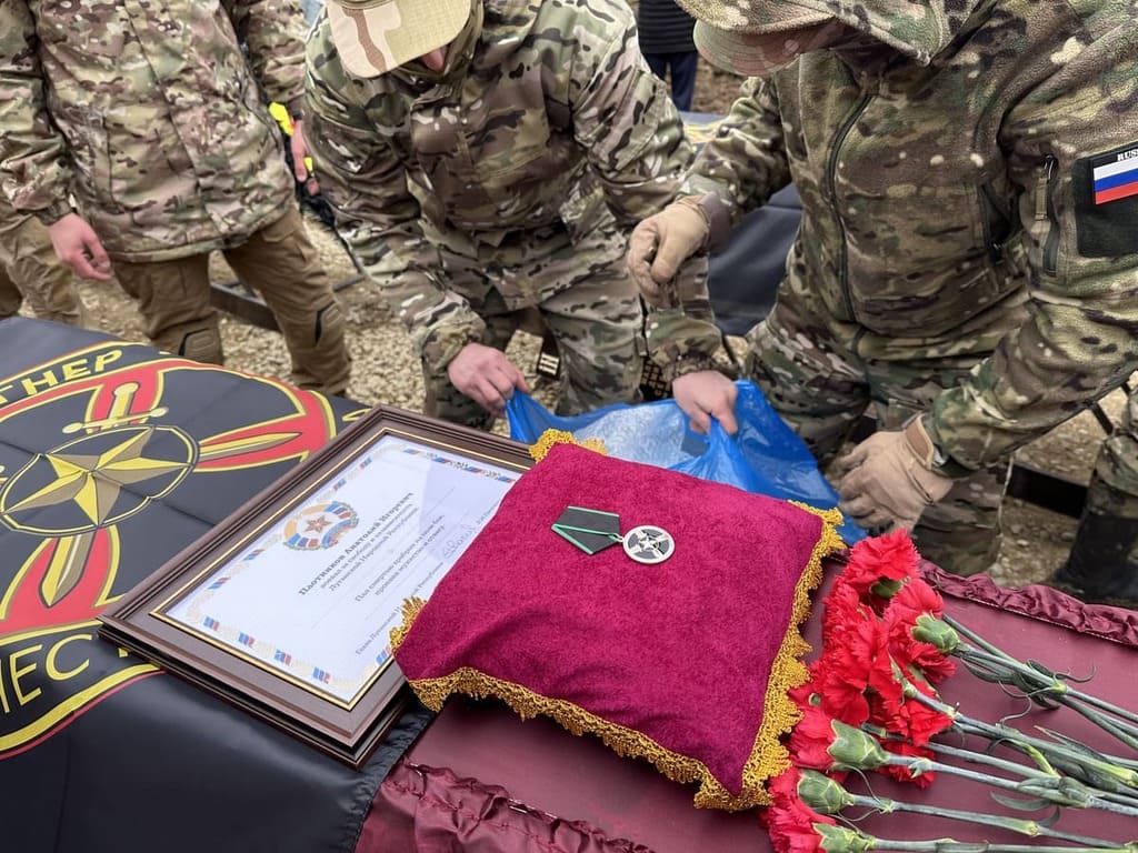 Когда восемь гробов выставили в два ряда, священник с молитвенником в руках начал отпевание. Время от времени он просил присутствующих читать вместе с ним молитвы, ходил между гробами, раскачивая кадилом с тлеющим ладаном. Примерно раз в несколько минут толпа крестилась — это делали все, кроме самих вагнеровцев.