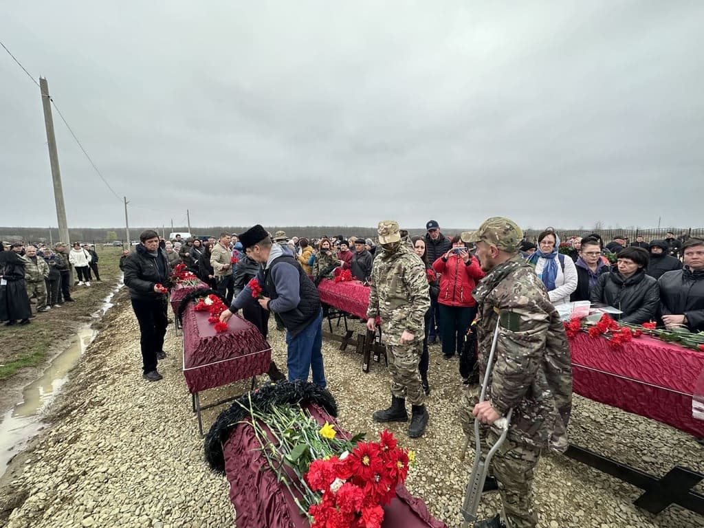 После чего люди по очереди подходили к гробам, клали цветы, молились и кланялись. При этом никто из тех, с кем удалось поговорить, лично бойцов не знал. Когда церемония прощания с незнакомыми наёмниками закончилась, четверо мужчин в камуфляже и масках взяли гробы и, утопая в грязи, понесли их к вырытым ямам. Люди подходили и кидали вниз комья земли.