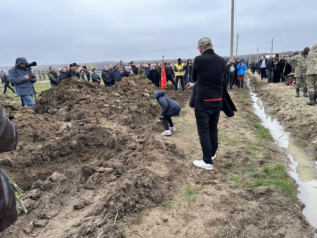 «Она потом будет в школе это изучать, а так она видела это всё. Они там, мы здесь», — объяснял отец девочки, обнимая её за плечи в метре от ямы.
