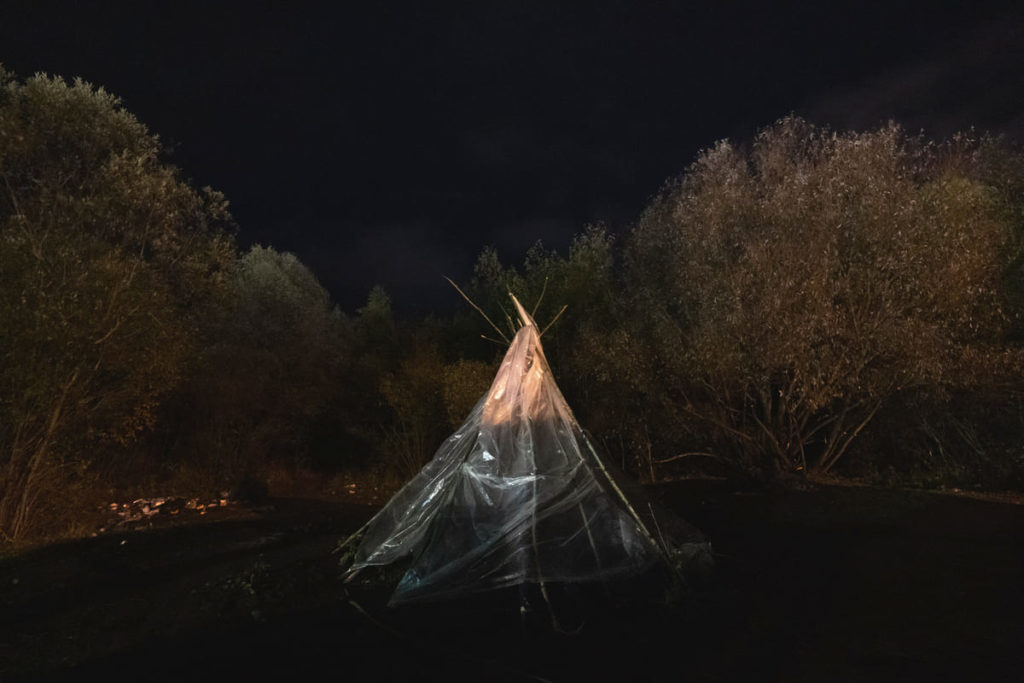 На фото — палатка из полиэтилена и веток, построенная украинскими беженцами перед пропускным пунктом Убылинка.