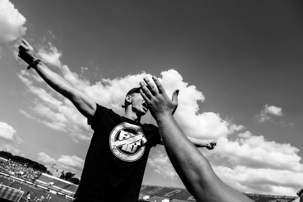 В какой-то момент обстановка на поле начала накаляться, все как будто вспрыгнули вверх и начали распевать кричалку, во время которой нужно было активно размахивать руками. Тогда я уже был на середине лестницы и даже получил пару раз по затылку, но нисколько не расстроился. Общий дух фанатской тусовки стимулировал меня снимать ещё и ещё, несмотря на все неудобства.