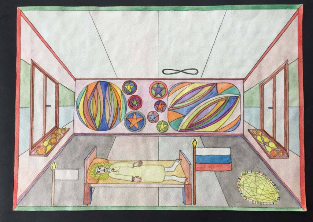 Оказалось, что работы на детскую конференцию принёс Михаил Солдатенков — один из школьных преподавателей, который помимо школы работал ещё и в психиатрической лечебнице Черняховска, где занимался с пациентами чем-то вроде арт-терапии. «Чем-то вроде» — потому что арт-терапией в полном смысле слова это назвать было нельзя, в России она тогда в принципе была не особенно развита, поэтому правильнее было назвать его просто художником-инструктором. Солдатенков, который с уважением относился к творчеству подопечных и пользовался возможностью явить его миру, рассказал Александре, что эти работы принадлежат одному из пациентов больницы, — причём, кажется, был не особо рад этому факту. Рядом с загадочными работами висела довольно наивная копия картины «Явление Христа народу», тоже рождённая в недрах лечебницы, и ею преподаватель явно гордился гораздо больше: её автор сначала рисовал «всякий кошмар», а потом его удалось «вдохновить и переучить».