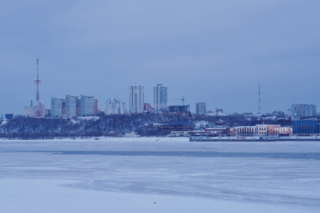 Вид на здание речного вокзала с правого берега Камы