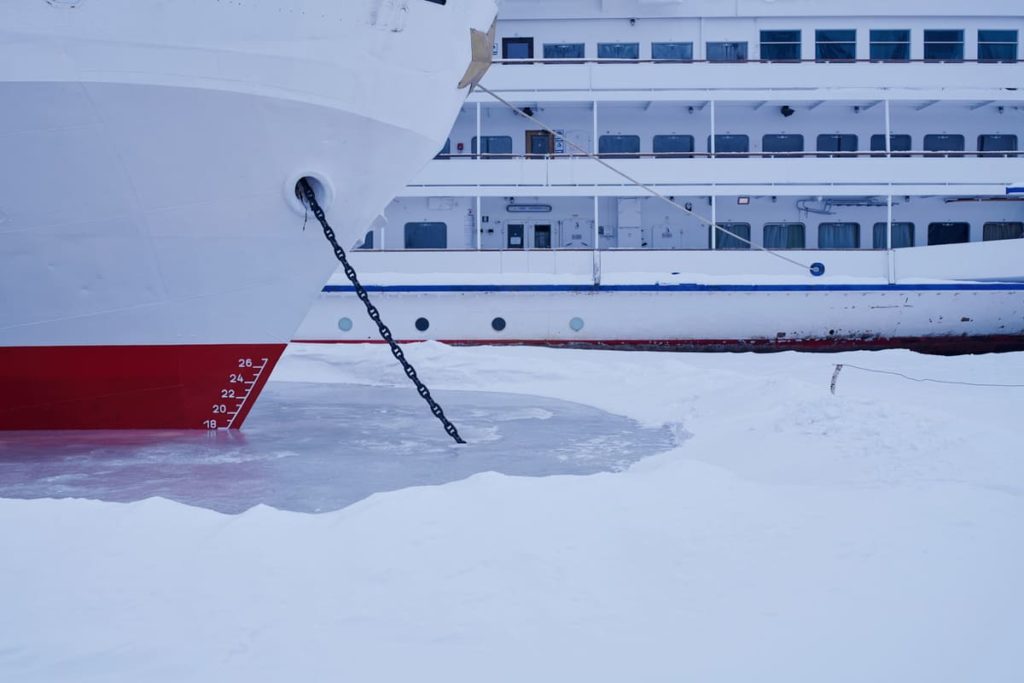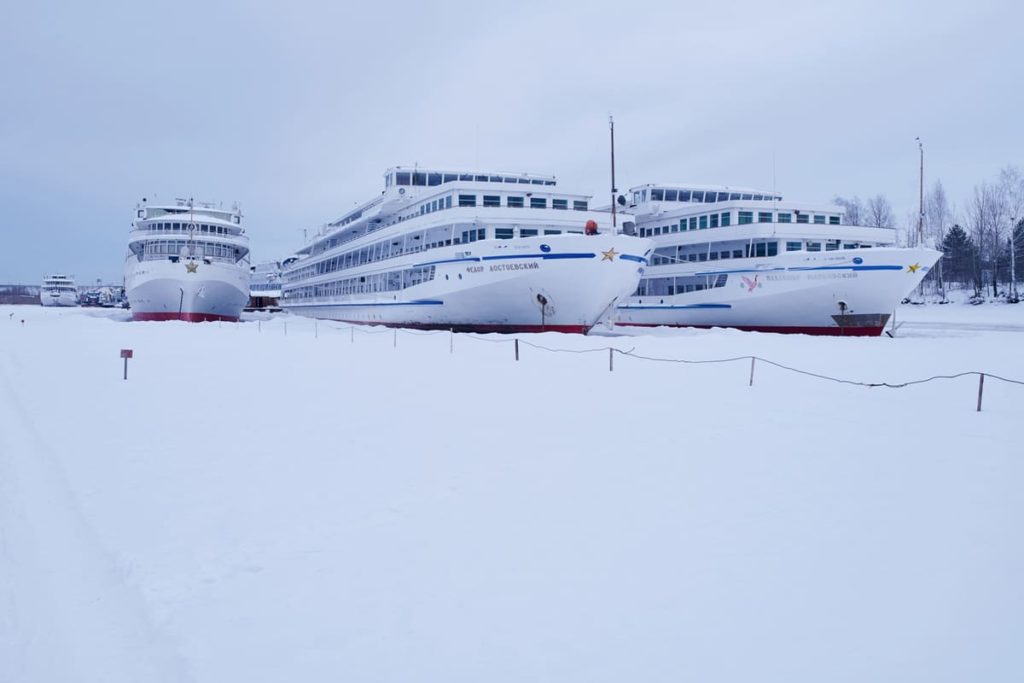 Круизные теплоходы пережидают зиму в затоне на Водниках