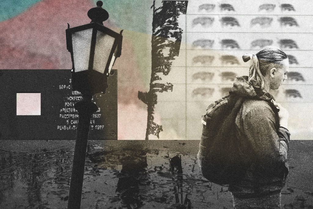 Иллюстрация на обложке: Анна Иванцова для НВ. Фото: Алексей Сабельский. На акции «Возвращённые имена» в Великом Новгороде председатель новгородского «Мемориала» Михаил Чимаров в одиночестве читал имена репрессированных