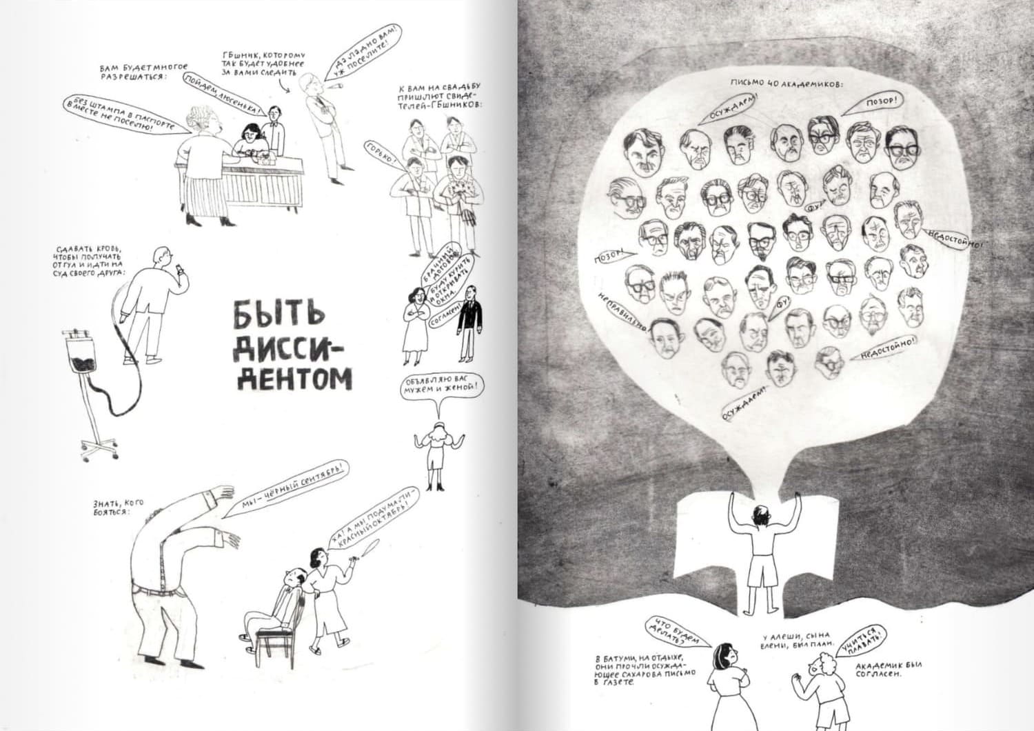 Когда она впервые пришла в «Мемориал» за консультацией для своего графического романа про Сахарова, то сказала, что хочет посвятить его тому, как люди справлялись с репрессиями. «И мне сказали: „Да, супер, отлично! Это и наша тактика тоже“», — рассказывает художница.