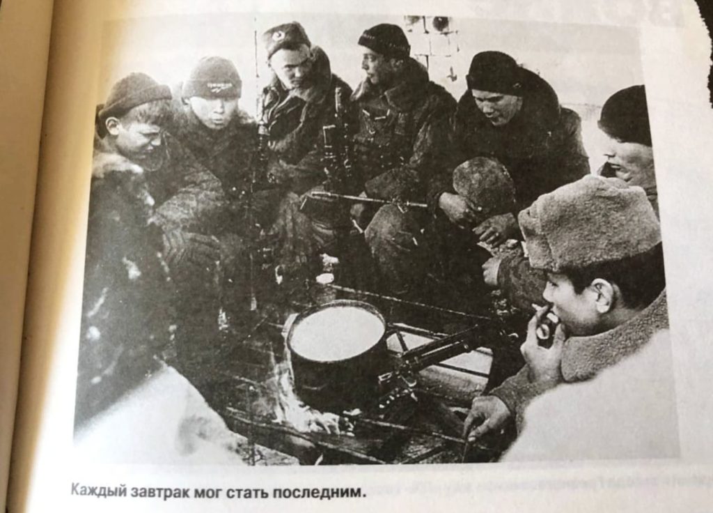 — Вот я сейчас найду… — Татьяна листает «Книгу памяти. Чечня» — хронику войны в материалах военкоров «Комсомольской правды с декабря 1994 по октябрь 1996 года. Наконец показывает фотографию с названием «Каждый завтрак может стать последним». На снимке солдаты сидят вокруг костра, на костровой решётке — закоптелая кастрюля с кашей. Третий справа, узнала Татьяна, её сын Владимир. Возможно, тогда-то они и написали письма своим родителям, думает мама.